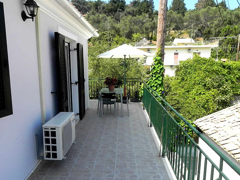 balcony to the front and to the side, equipped with table, chairs, sun beds and